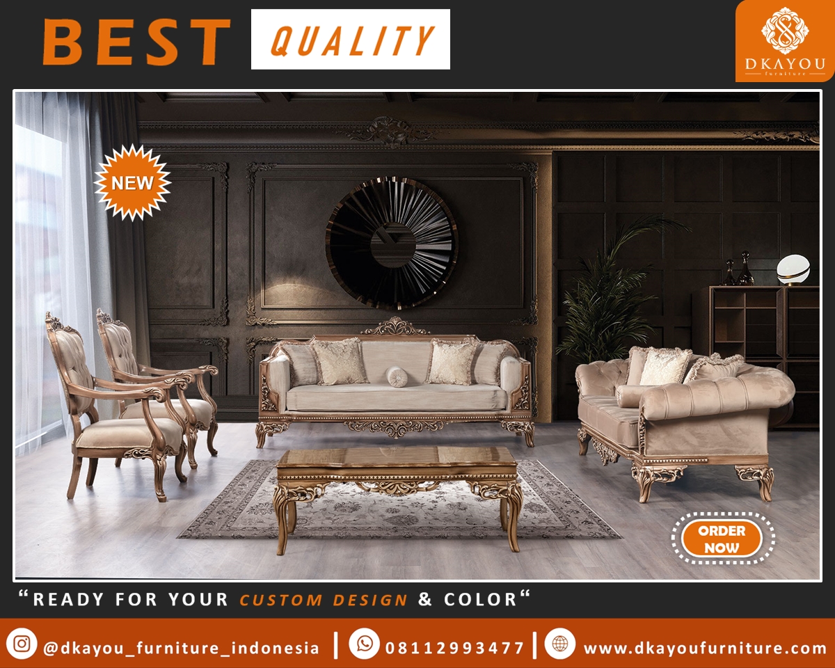 Sofa Klasik Mewah – Desain kursi untuk ruang tamu ini bisa anda pesan untuk ruangan berukuran sedang sampai besar, konsep klasik modern yang diusung menjadikan sofa model ini sesuai untuk rumah bergaya romawi. Berbagai desain furniture terbaru bisa anda lihat di website resmi kami, silahkan juga custom model atau request sesuai keinginan. Komitmen kami selalu memberikan pelayanan dan harga terbaik.