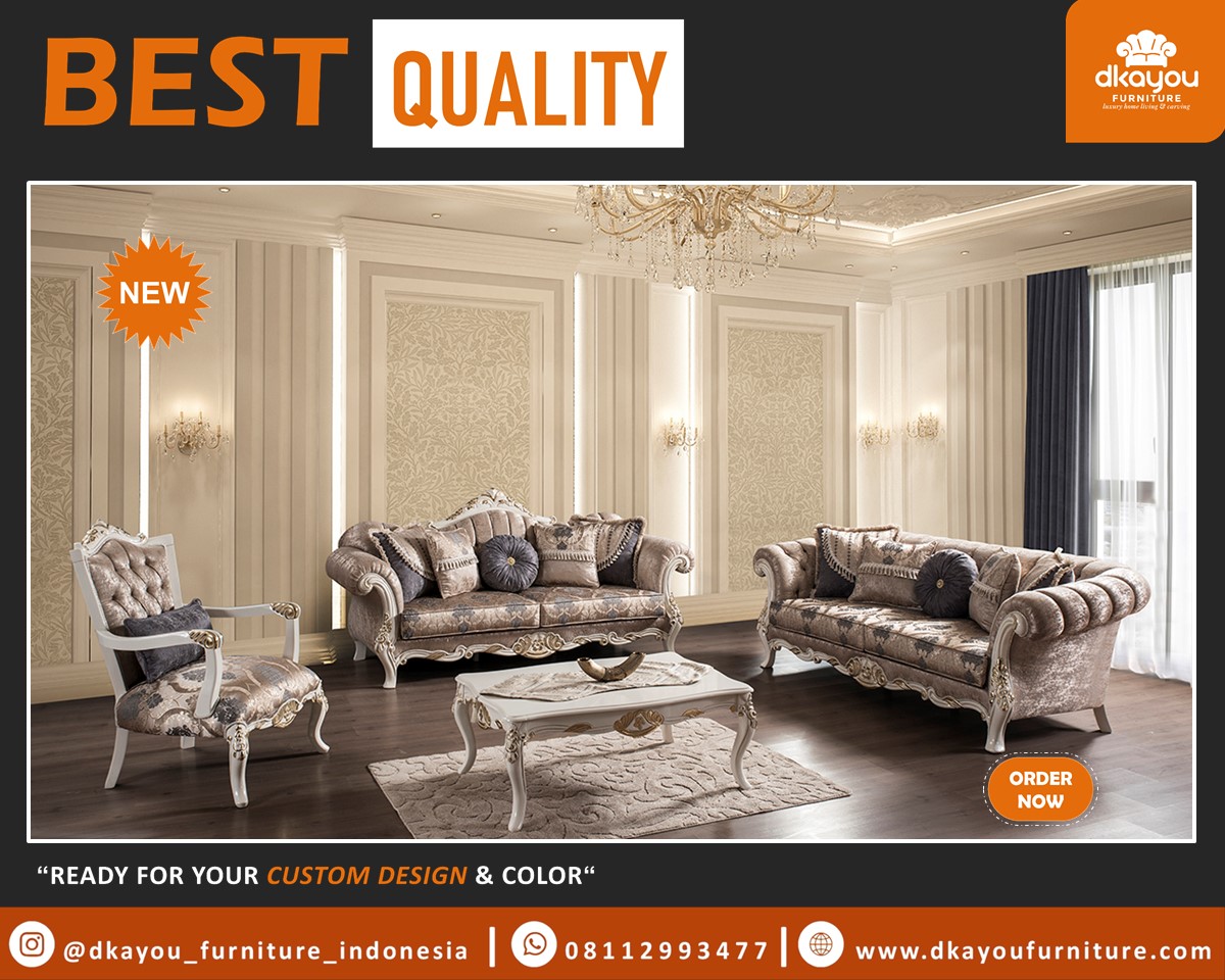 Sofa Modern Klasik Desain Ruang Tamu Mewah Elegan merupakan rangkaian 1 set livingroom design yang terdiri dari sofa 3 seater, sofa 2 seater, dan sofa 1 seater. Bahan baku kayu mahoni solid serta finishing duco mewah.